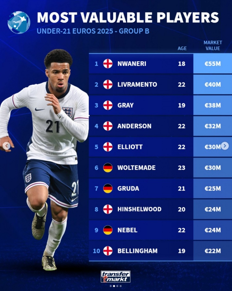 6月12日讯 U21欧洲杯开赛,德转统计了各组球员身价,恩瓦内里5500万欧在所有球员中最高,昆达4500万欧第二,利夫拉门托、卢克巴4000万欧第三。