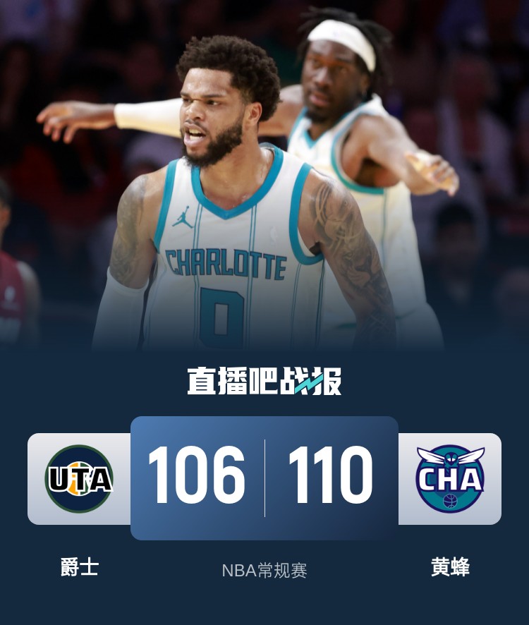 开场后黄蜂在布里奇斯带领下内外开花早早建立两位数领先,爵士的轮换阵容在衔接段掀起反扑追上比分,黄蜂外线连中三记三分稳住局面,爵士继续紧追不舍。下半场回来爵士延续反扑势头继续咬住比分,库里连投带罚帮黄蜂保持微弱优势。第三节尾声爵士一度连中三分将比分追平。最后一节马威内线表现活跃频频砍分,黄蜂始终保持场上微弱优势,最终黄蜂110-106击败爵士结束5连败,爵士遭遇6连败。