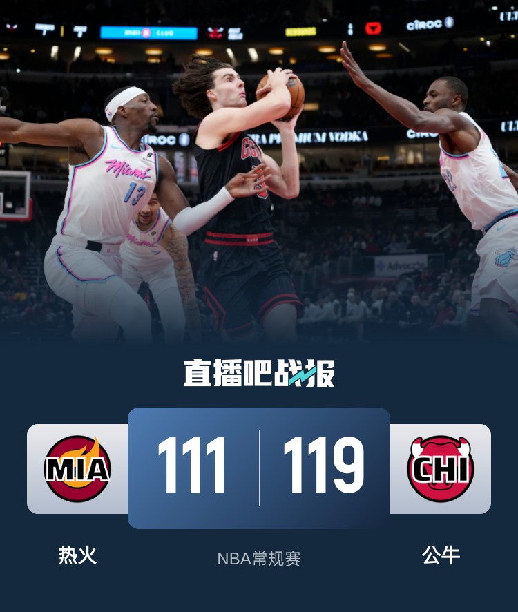 比赛开始,热火上来反客为主轰出8-0,但基迪带领公牛开始追分,但热火全民皆兵连续取分,首节热火领先5分,次节热火进攻端有些断电,基迪接连突破同时串联球队带队反超比分,特里三分再进,公牛半场反超6分。下半场,基迪继续全面发挥,有攻有传带队拉开双位数领先,希罗里突外投联手阿德巴约带队追分,三节公牛依然领先8分,末节双方命中率都有下降,面对热火追分公牛能回应,并始终保持10分左右领先,最终公牛119-111力克热火。