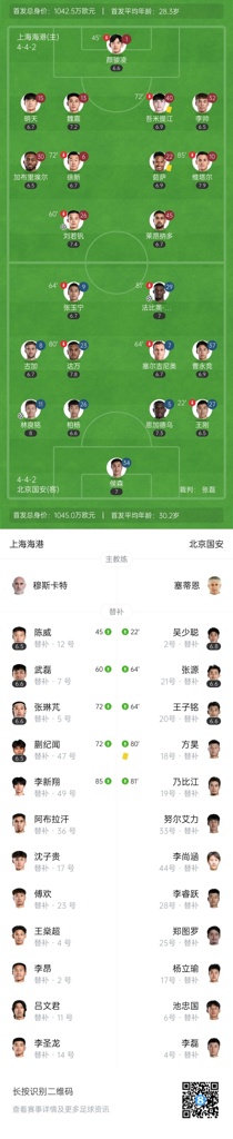 第40分钟,上海海港左侧角球机会,维塔尔将球罚向禁区,刘若钒甩头攻门得手,上海海港1-0北京国安。↓