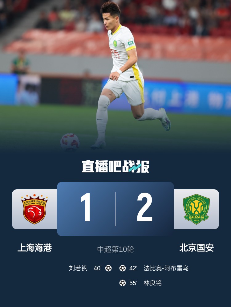 5月1日讯 北京时间5月1日19:35,中超联赛第10轮,上海海港坐镇浦东足球场迎战北京国安。上半场加布里埃尔一过三后射门被挡,王刚伤退,维塔尔角球助攻刘若钒头球破门,法比奥扳平,上海海港暂1-1北京国安;下半场林良铭搓射进球,最终北京国安客场2-1逆转上海海港,升至积分榜第三位,距榜首4分。