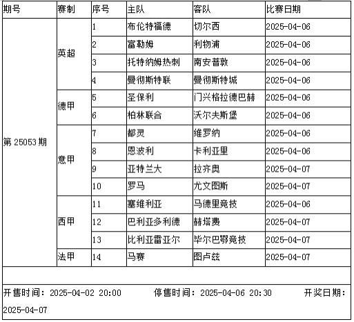 传足胜负彩第25053期竞猜赛事为欧洲五大联赛,其中不乏豪门出战和强强对话:英超方面,曼市德比打响,利物浦客场面对富勒姆;意甲有两场强强对话,亚特兰大主场对战拉齐奥,罗马VS尤文图斯。