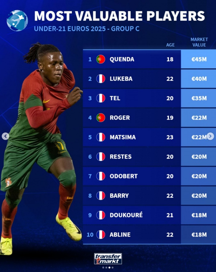 6月12日讯 U21欧洲杯开赛,德转统计了各组球员身价,恩瓦内里5500万欧在所有球员中最高,昆达4500万欧第二,利夫拉门托、卢克巴4000万欧第三。