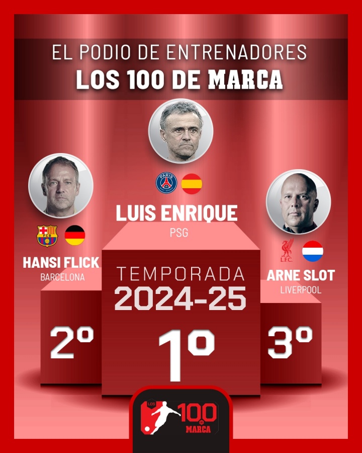 07月25日讯 西班牙媒体《马卡报》评选24/25赛季最佳主帅,巴黎主帅恩里克当选,他率领巴黎豪取法甲、法国杯、法国超级杯和欧冠四冠王。巴萨主帅弗里克第二、利物浦主帅斯洛特第三。