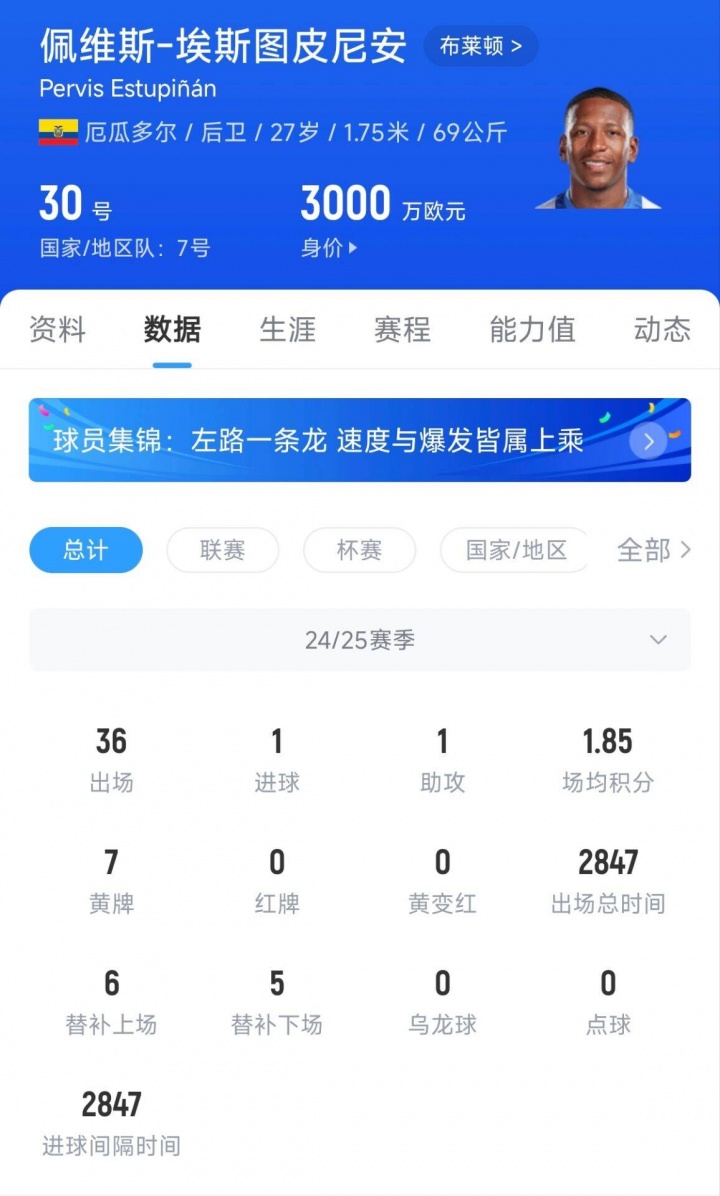 27岁的埃斯图皮尼安是厄瓜多尔国脚,身价3000万欧,上赛季这位边后卫为布莱顿出战36场比赛1球1助。