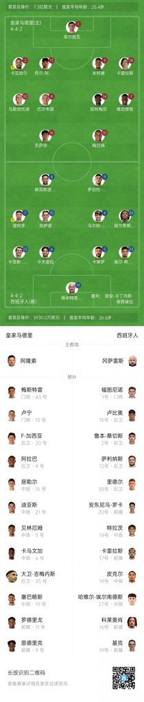 皇马首发:1-库尔图瓦、2-卡瓦哈尔、3-米利唐、17-劳尔-阿森西奥、18-A费、8-巴尔韦德、14-琼阿梅尼、30-马斯坦托诺、7-维尼修斯、10-姆巴佩、16-贡萨洛-加西亚